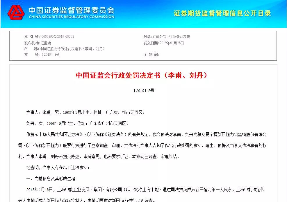 1月28日,证监会披露,依法对李甫、刘丹内幕交易宁夏新日恒力钢丝绳股份有限公司股票行为作出行政处罚。